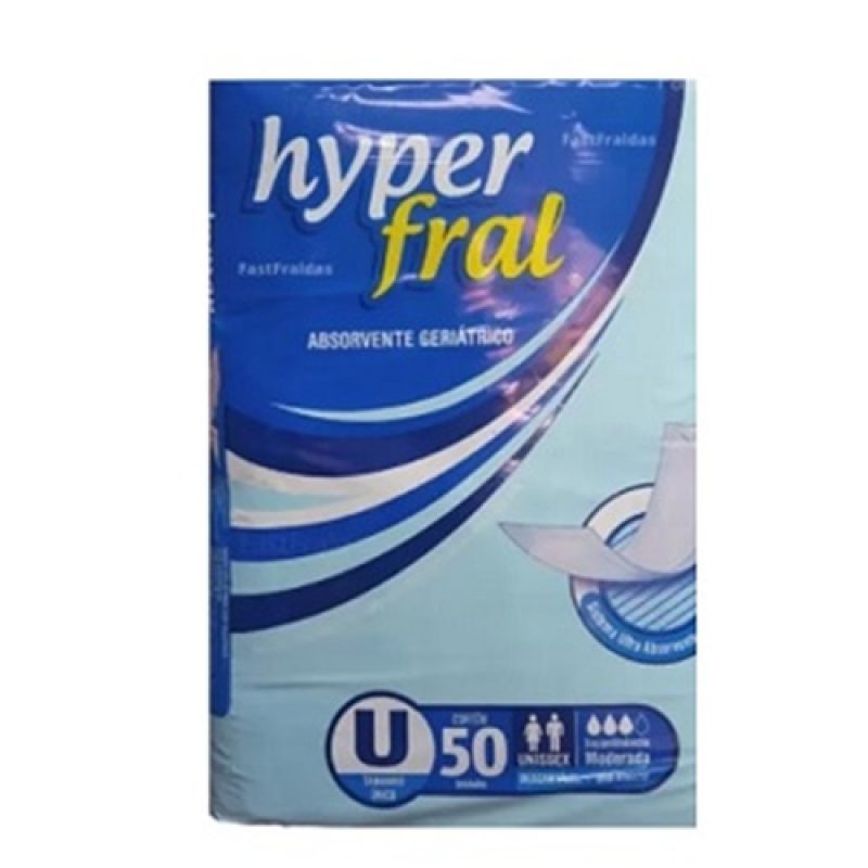 O absorvente Hyper Fral é unissex de uso adulto. Indicado para incontinênciamoderada, pré e pós operatório. Possuí três camadas: uma camada macia e antilégica que mantem a pele seca e protegida; colchão de polpa de celulose com alto poder de absorção, neuto, super macio e antialérgico e uma camada plástica impermável para retenção do líquido e melhor absorção. Com sistema ultra absorvente que retém o fluxo.